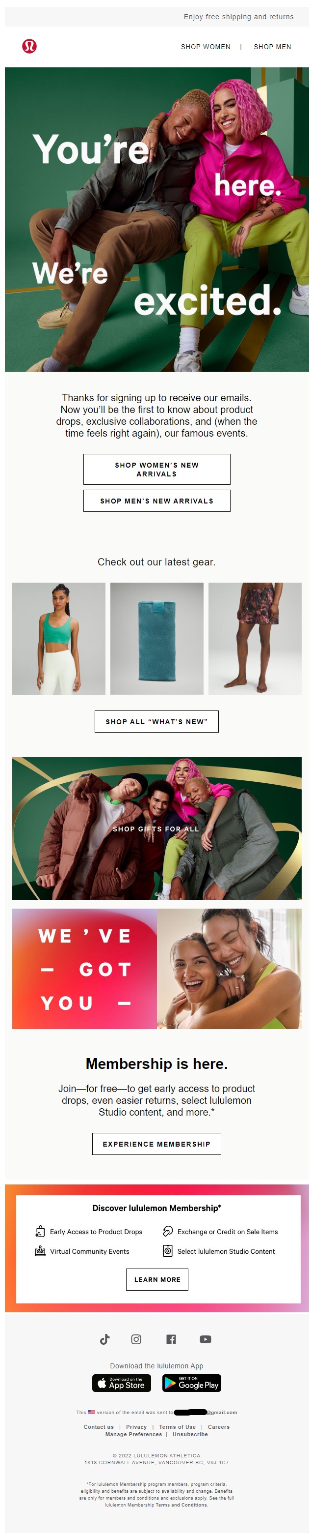 Download the free html template laid out just like Lululemon's Welcome email. Just plug in your content.